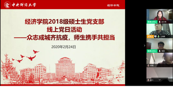 为深入学习贯彻习近平总书记关于疫情防控的重要讲话和指示精神,坚决打赢疫情防控的人民战争、总体战、阻击战,积极响应学院党委要求,德赢AC米兰官网2018级硕士生第一、二、三党支部联合教工党支部,于2月24日开展线上主题党日活动。德赢AC米兰官网院长陈斌开、组织员刘滨、政治经济学系何召鹏、党务秘书窦宗玥等老师与2018级60余名硕士生党员、入党积极分子共同参与活动。活动由2018级硕士生第三党支部书记王继彬主持。